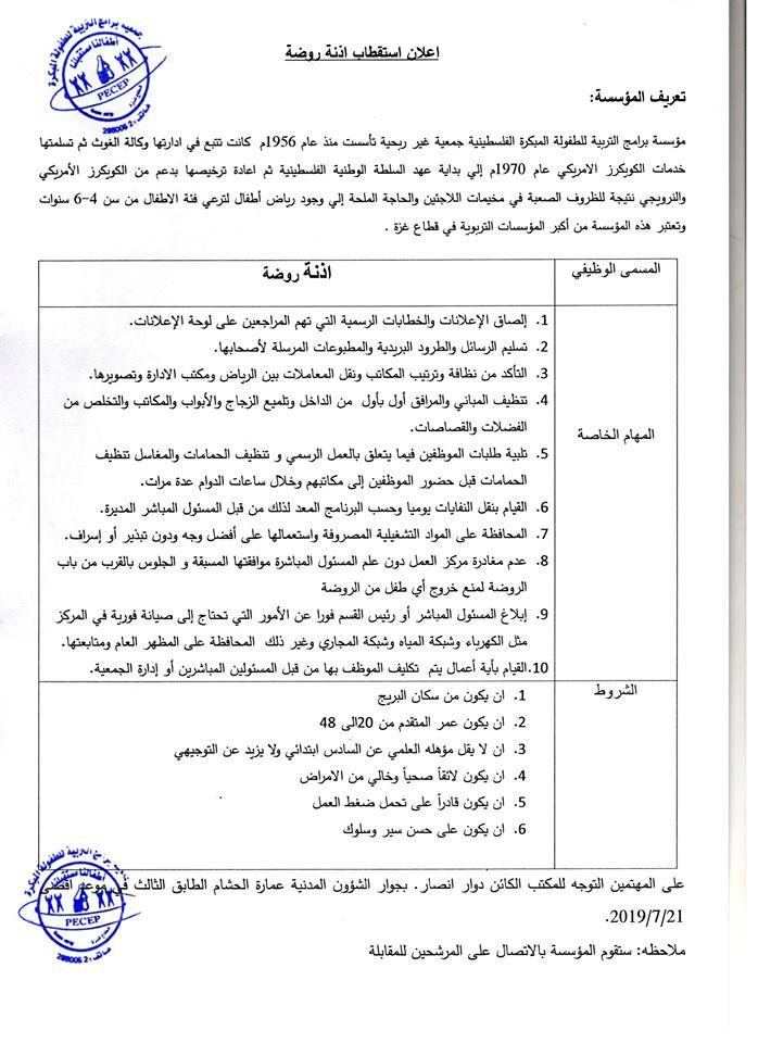 اعلان توظيف " آذنة روضة " --- جمعية مؤسسة برامج التربية للطفولة المبكرة الفلسطينية calendar_month2019/07/17 08:55 am visibility 1,463 مقالات ذات صلة share إعلان تشغيل عمال نظافة وعمال تنظيف مصافي ومناهل مياه الأمطار بالتعاون بين بلدية غزة واللجنة الدولية للصليب الأحمر التفاصيل ...share اعلان توظيف مدخل/ة بيانات لدى أطباء العالم فرنساالتفاصيل ...share اعلان توظيف ممرضين لدى الهيئة الطبية الدوليةالتفاصيل ...share كشف مستفيدي الغاز لتاريخ 24-11-2025 التفاصيل ...share اعلان وظائف تدريسية في وزارة التربية والتعليم والتعليم العالي، بدولة قطرالتفاصيل ...share إعلان توظيف – مساعد إداري لدى مستشفى أصدقاء المريضالتفاصيل ... يمنع استخدام برامج النسخ