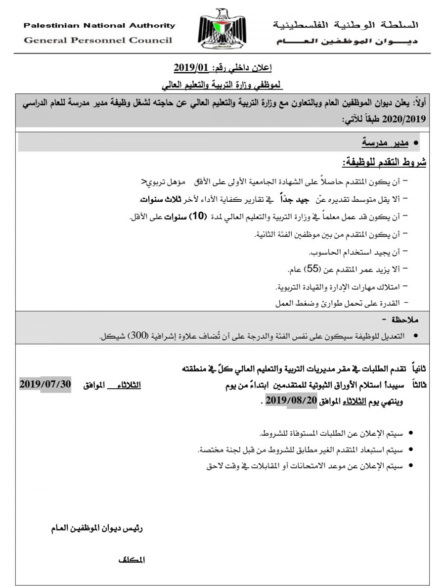 اعلان توظيف داخلي لتعيين مدير مدرسة --- ديوان الموظفين العام calendar_month2019/07/29 02:05 pm visibility 1,666 مقالات ذات صلة share إعلان تشغيل عمال نظافة وعمال تنظيف مصافي ومناهل مياه الأمطار بالتعاون بين بلدية غزة واللجنة الدولية للصليب الأحمر التفاصيل ...share اعلان توظيف مدخل/ة بيانات لدى أطباء العالم فرنساالتفاصيل ...share اعلان توظيف ممرضين لدى الهيئة الطبية الدوليةالتفاصيل ...share كشف مستفيدي الغاز لتاريخ 24-11-2025 التفاصيل ...share اعلان وظائف تدريسية في وزارة التربية والتعليم والتعليم العالي، بدولة قطرالتفاصيل ...share إعلان توظيف – مساعد إداري لدى مستشفى أصدقاء المريضالتفاصيل ... يمنع استخدام برامج النسخ
