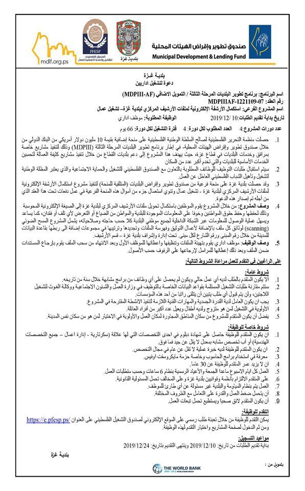 اعلان تشغيل مؤقت " إداريين دبلوم " / بلدية غزة رابط التسجيل calendar_month2019/12/11 01:38 pm visibility 1,411 مقالات ذات صلة share إعلان تشغيل عمال نظافة وعمال تنظيف مصافي ومناهل مياه الأمطار بالتعاون بين بلدية غزة واللجنة الدولية للصليب الأحمر التفاصيل ...share اعلان توظيف مدخل/ة بيانات لدى أطباء العالم فرنساالتفاصيل ...share اعلان توظيف ممرضين لدى الهيئة الطبية الدوليةالتفاصيل ...share كشف مستفيدي الغاز لتاريخ 24-11-2025 التفاصيل ...share اعلان وظائف تدريسية في وزارة التربية والتعليم والتعليم العالي، بدولة قطرالتفاصيل ...share إعلان توظيف – مساعد إداري لدى مستشفى أصدقاء المريضالتفاصيل ... يمنع استخدام برامج النسخ