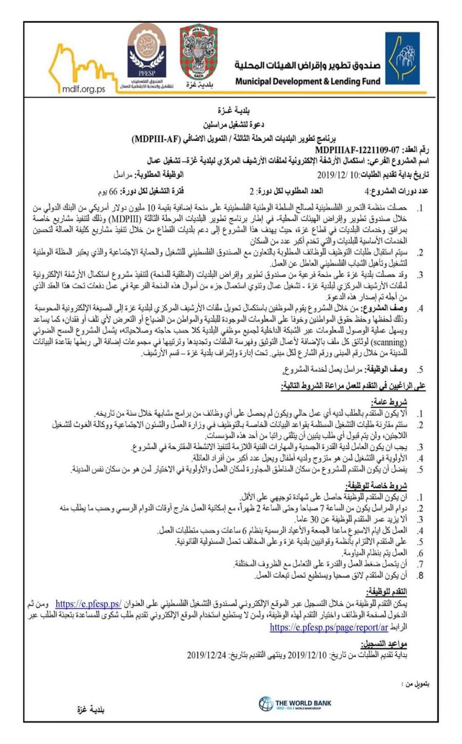 فرص تشغيل " مراسلين " -- بلدية غزة نموذج التسجيل calendar_month2019/12/14 01:11 pm visibility 1,672 مقالات ذات صلة share إعلان تشغيل عمال نظافة وعمال تنظيف مصافي ومناهل مياه الأمطار بالتعاون بين بلدية غزة واللجنة الدولية للصليب الأحمر التفاصيل ...share اعلان توظيف مدخل/ة بيانات لدى أطباء العالم فرنساالتفاصيل ...share اعلان توظيف ممرضين لدى الهيئة الطبية الدوليةالتفاصيل ...share كشف مستفيدي الغاز لتاريخ 24-11-2025 التفاصيل ...share اعلان وظائف تدريسية في وزارة التربية والتعليم والتعليم العالي، بدولة قطرالتفاصيل ...share إعلان توظيف – مساعد إداري لدى مستشفى أصدقاء المريضالتفاصيل ... يمنع استخدام برامج النسخ