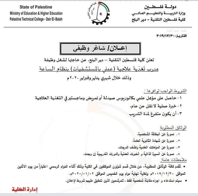 اعلان توظيف " مدرب تغذية علاجية " -- كلية فلسطين التقنية calendar_month2019/12/31 08:33 am visibility 1,036 مقالات ذات صلة share إعلان تشغيل عمال نظافة وعمال تنظيف مصافي ومناهل مياه الأمطار بالتعاون بين بلدية غزة واللجنة الدولية للصليب الأحمر التفاصيل ...share اعلان توظيف مدخل/ة بيانات لدى أطباء العالم فرنساالتفاصيل ...share اعلان توظيف ممرضين لدى الهيئة الطبية الدوليةالتفاصيل ...share كشف مستفيدي الغاز لتاريخ 24-11-2025 التفاصيل ...share اعلان وظائف تدريسية في وزارة التربية والتعليم والتعليم العالي، بدولة قطرالتفاصيل ...share إعلان توظيف – مساعد إداري لدى مستشفى أصدقاء المريضالتفاصيل ... يمنع استخدام برامج النسخ
