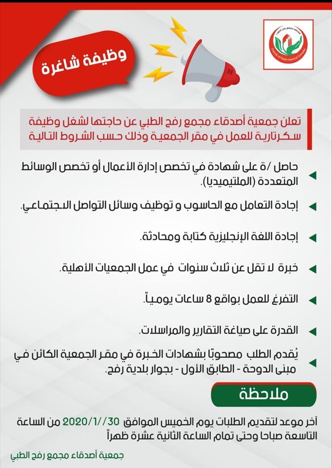 اعلان توظيف " سكرتاريا " -- جمعية أصدقاء مجمع رفح الطبي calendar_month2020/01/28 08:08 am visibility 915 مقالات ذات صلة share إعلان تشغيل عمال نظافة وعمال تنظيف مصافي ومناهل مياه الأمطار بالتعاون بين بلدية غزة واللجنة الدولية للصليب الأحمر التفاصيل ...share اعلان توظيف مدخل/ة بيانات لدى أطباء العالم فرنساالتفاصيل ...share اعلان توظيف ممرضين لدى الهيئة الطبية الدوليةالتفاصيل ...share كشف مستفيدي الغاز لتاريخ 24-11-2025 التفاصيل ...share اعلان وظائف تدريسية في وزارة التربية والتعليم والتعليم العالي، بدولة قطرالتفاصيل ...share إعلان توظيف – مساعد إداري لدى مستشفى أصدقاء المريضالتفاصيل ... يمنع استخدام برامج النسخ