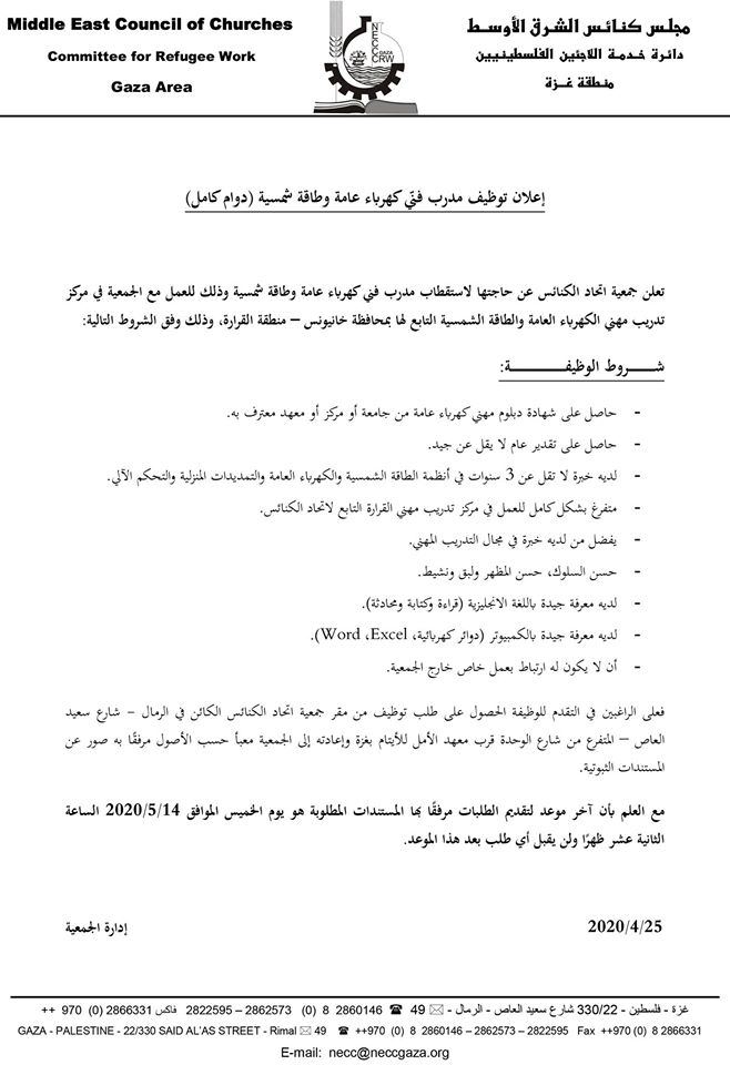 اعلان توظيف " مدرب فني كهرباء عامة وطاقة شمسية " -- جمعية اتحاد الكنائس calendar_month2020/04/27 10:49 am visibility 951 مقالات ذات صلة share إعلان تشغيل عمال نظافة وعمال تنظيف مصافي ومناهل مياه الأمطار بالتعاون بين بلدية غزة واللجنة الدولية للصليب الأحمر التفاصيل ...share اعلان توظيف مدخل/ة بيانات لدى أطباء العالم فرنساالتفاصيل ...share اعلان توظيف ممرضين لدى الهيئة الطبية الدوليةالتفاصيل ...share كشف مستفيدي الغاز لتاريخ 24-11-2025 التفاصيل ...share اعلان وظائف تدريسية في وزارة التربية والتعليم والتعليم العالي، بدولة قطرالتفاصيل ...share إعلان توظيف – مساعد إداري لدى مستشفى أصدقاء المريضالتفاصيل ... يمنع استخدام برامج النسخ