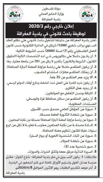اعلان توظيف " باحث قانوني " -- بلدية المغراقة calendar_month2020/05/31 09:53 am visibility 1,086 مقالات ذات صلة share إعلان تشغيل عمال نظافة وعمال تنظيف مصافي ومناهل مياه الأمطار بالتعاون بين بلدية غزة واللجنة الدولية للصليب الأحمر التفاصيل ...share اعلان توظيف مدخل/ة بيانات لدى أطباء العالم فرنساالتفاصيل ...share اعلان توظيف ممرضين لدى الهيئة الطبية الدوليةالتفاصيل ...share كشف مستفيدي الغاز لتاريخ 24-11-2025 التفاصيل ...share اعلان وظائف تدريسية في وزارة التربية والتعليم والتعليم العالي، بدولة قطرالتفاصيل ...share إعلان توظيف – مساعد إداري لدى مستشفى أصدقاء المريضالتفاصيل ... يمنع استخدام برامج النسخ
