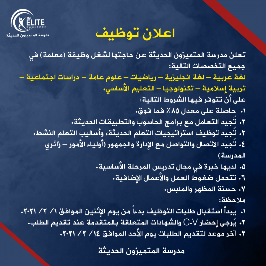 اعلان توظيف " معلمات " في كافة التخصصات --- مدرسة المتميزون الحديثة عنوان المدرسة / غزة - الرمال - شارع الشهداء - مقابل مطعم الطابون calendar_month2021/01/31 01:24 pm visibility 1,226 مقالات ذات صلة share إعلان تشغيل عمال نظافة وعمال تنظيف مصافي ومناهل مياه الأمطار بالتعاون بين بلدية غزة واللجنة الدولية للصليب الأحمر التفاصيل ...share اعلان توظيف مدخل/ة بيانات لدى أطباء العالم فرنساالتفاصيل ...share اعلان توظيف ممرضين لدى الهيئة الطبية الدوليةالتفاصيل ...share كشف مستفيدي الغاز لتاريخ 24-11-2025 التفاصيل ...share اعلان وظائف تدريسية في وزارة التربية والتعليم والتعليم العالي، بدولة قطرالتفاصيل ...share إعلان توظيف – مساعد إداري لدى مستشفى أصدقاء المريضالتفاصيل ... يمنع استخدام برامج النسخ