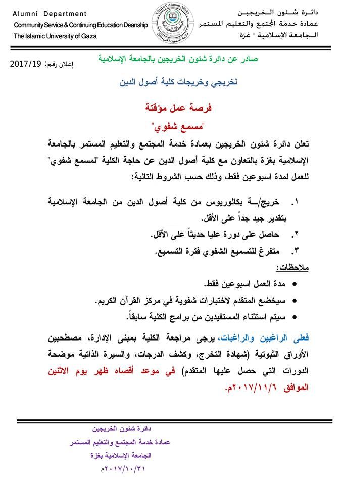 فرصة عمل مؤقتة " مسمع شفوي " -- دائرة شؤون الخريجين بالإسلامية بالتعاون مع كلية أصول الدين calendar_month2017/10/31 07:41 pm visibility 1,352 مقالات ذات صلة share إعلان تشغيل عمال نظافة وعمال تنظيف مصافي ومناهل مياه الأمطار بالتعاون بين بلدية غزة واللجنة الدولية للصليب الأحمر التفاصيل ...share اعلان توظيف مدخل/ة بيانات لدى أطباء العالم فرنساالتفاصيل ...share اعلان توظيف ممرضين لدى الهيئة الطبية الدوليةالتفاصيل ...share كشف مستفيدي الغاز لتاريخ 24-11-2025 التفاصيل ...share اعلان وظائف تدريسية في وزارة التربية والتعليم والتعليم العالي، بدولة قطرالتفاصيل ...share إعلان توظيف – مساعد إداري لدى مستشفى أصدقاء المريضالتفاصيل ... يمنع استخدام برامج النسخ