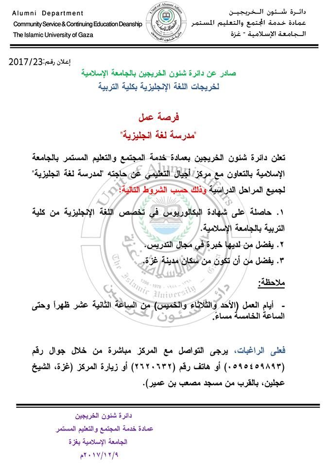 فرصة عمل " معلمة لغة إنجليزية " -- دائرة شؤون الخريجين بالجامعة الإسلامية بالتعاون مع مركز أجيال التعليمي calendar_month2017/12/09 03:16 pm visibility 1,117 مقالات ذات صلة share إعلان تشغيل عمال نظافة وعمال تنظيف مصافي ومناهل مياه الأمطار بالتعاون بين بلدية غزة واللجنة الدولية للصليب الأحمر التفاصيل ...share اعلان توظيف مدخل/ة بيانات لدى أطباء العالم فرنساالتفاصيل ...share اعلان توظيف ممرضين لدى الهيئة الطبية الدوليةالتفاصيل ...share كشف مستفيدي الغاز لتاريخ 24-11-2025 التفاصيل ...share اعلان وظائف تدريسية في وزارة التربية والتعليم والتعليم العالي، بدولة قطرالتفاصيل ...share إعلان توظيف – مساعد إداري لدى مستشفى أصدقاء المريضالتفاصيل ... يمنع استخدام برامج النسخ