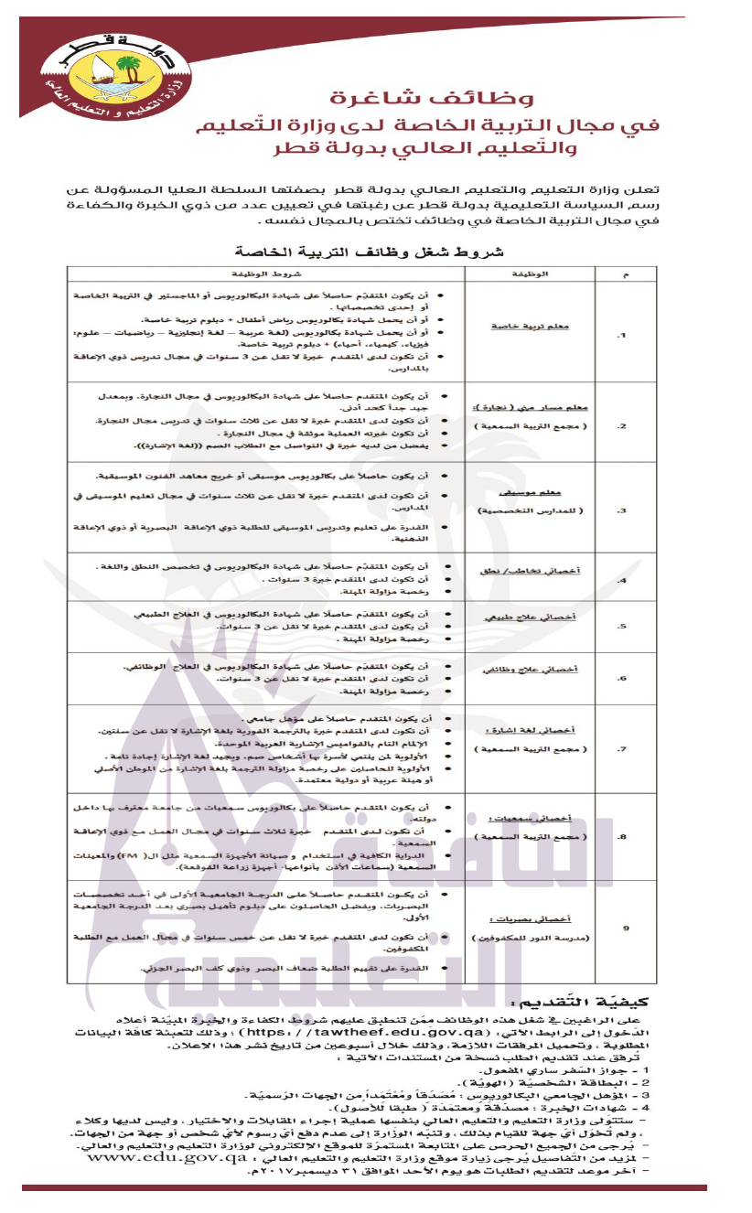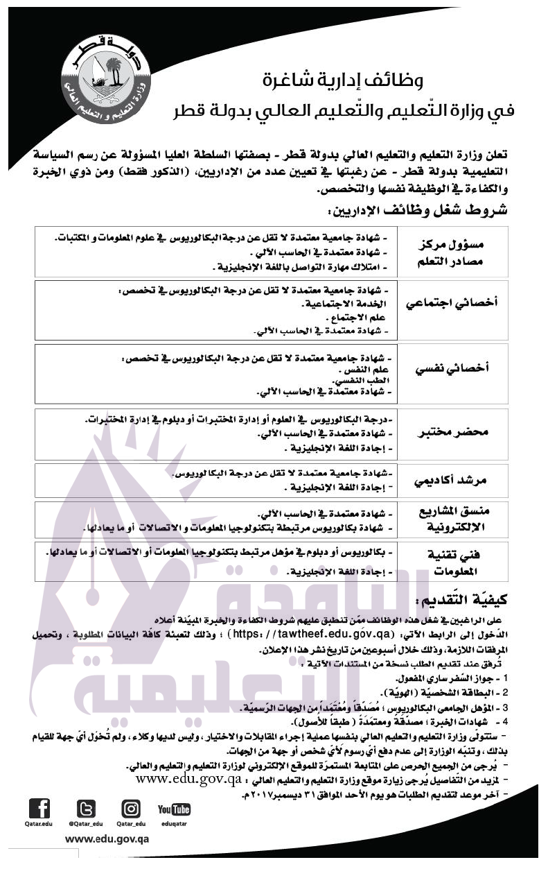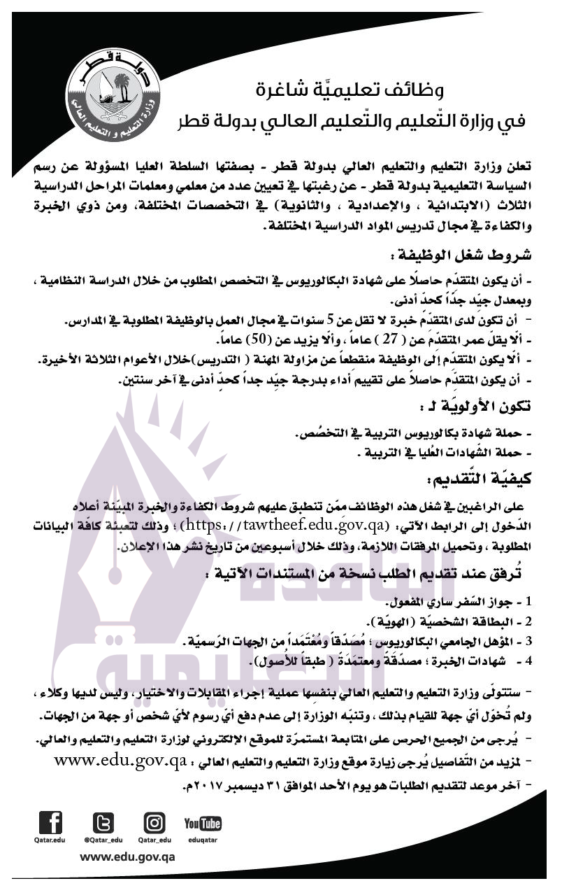 اعلان وظائف إدارية و تعليمية ( معلمين و معلمات ) -- دولة قطر بالتعاون مع وزارة التربية و التعليم العالي نموذج التقديم calendar_month2017/12/16 03:49 pm visibility 4,803