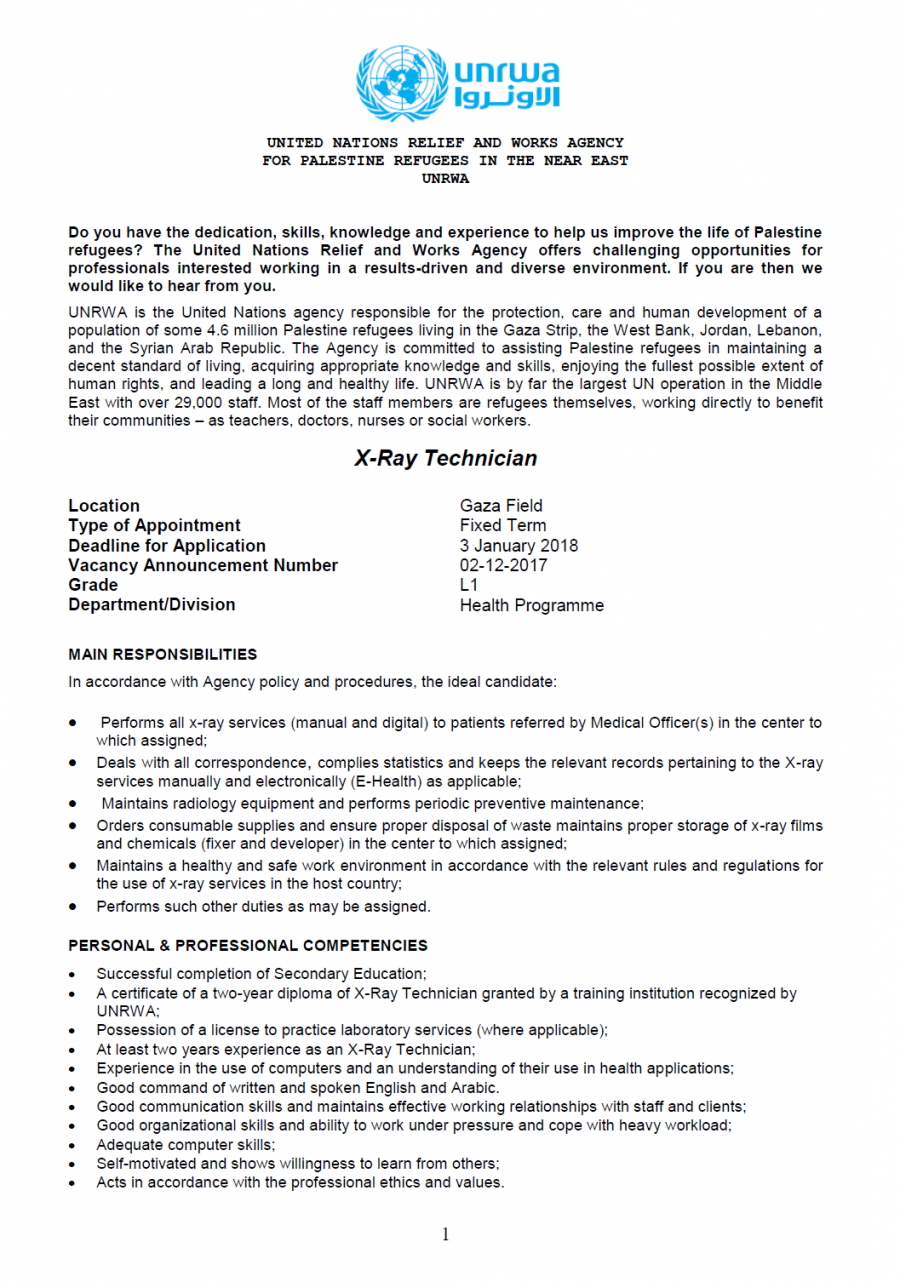اعلان توظيف " فني أشعة " -- دائرة الصحة بوكالة الغوث مسمى الوظيفة : فني أشعةالدائرة : الصحة - وكالة الغوثالراتب : 1,178.20$أخر موعد للتقديم : 3/1/2018 نموذج التسجيل calendar_month2017/12/21 07:57 am visibility 1,425 مقالات ذات صلة share إعلان تشغيل عمال نظافة وعمال تنظيف مصافي ومناهل مياه الأمطار بالتعاون بين بلدية غزة واللجنة الدولية للصليب الأحمر التفاصيل ...share اعلان توظيف مدخل/ة بيانات لدى أطباء العالم فرنساالتفاصيل ...share اعلان توظيف ممرضين لدى الهيئة الطبية الدوليةالتفاصيل ...share كشف مستفيدي الغاز لتاريخ 24-11-2025 التفاصيل ...share اعلان وظائف تدريسية في وزارة التربية والتعليم والتعليم العالي، بدولة قطرالتفاصيل ...share إعلان توظيف – مساعد إداري لدى مستشفى أصدقاء المريضالتفاصيل ... يمنع استخدام برامج النسخ