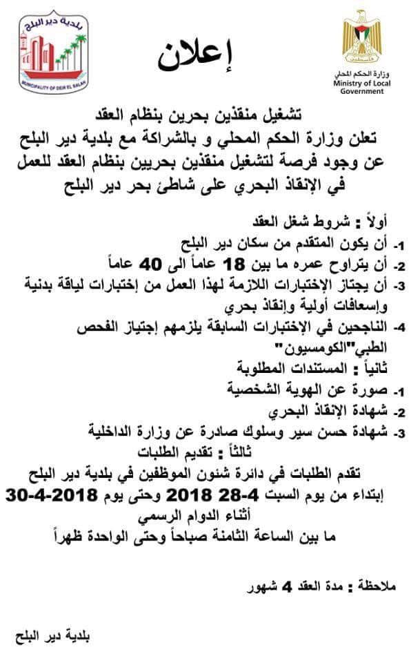 اعلان تشغيل " منقذين بحريين " بنظام العقد -- وزارة الحكم المحلي بالشراكة مع بلدية دير البلح calendar_month2018/04/27 11:37 am visibility 966 مقالات ذات صلة share إعلان تشغيل عمال نظافة وعمال تنظيف مصافي ومناهل مياه الأمطار بالتعاون بين بلدية غزة واللجنة الدولية للصليب الأحمر التفاصيل ...share اعلان توظيف مدخل/ة بيانات لدى أطباء العالم فرنساالتفاصيل ...share اعلان توظيف ممرضين لدى الهيئة الطبية الدوليةالتفاصيل ...share كشف مستفيدي الغاز لتاريخ 24-11-2025 التفاصيل ...share اعلان وظائف تدريسية في وزارة التربية والتعليم والتعليم العالي، بدولة قطرالتفاصيل ...share إعلان توظيف – مساعد إداري لدى مستشفى أصدقاء المريضالتفاصيل ... يمنع استخدام برامج النسخ
