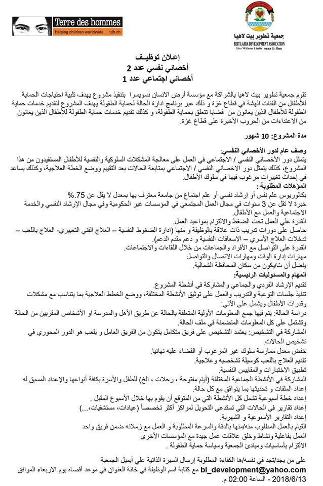 اعلان توظيف " أخصائي نفسي عدد 2 - أخصائي إجتماعي عدد 1 " @ جمعية تطوير بيت لاهيا calendar_month2018/06/09 08:59 pm visibility 1,334 مقالات ذات صلة share إعلان تشغيل عمال نظافة وعمال تنظيف مصافي ومناهل مياه الأمطار بالتعاون بين بلدية غزة واللجنة الدولية للصليب الأحمر التفاصيل ...share اعلان توظيف مدخل/ة بيانات لدى أطباء العالم فرنساالتفاصيل ...share اعلان توظيف ممرضين لدى الهيئة الطبية الدوليةالتفاصيل ...share كشف مستفيدي الغاز لتاريخ 24-11-2025 التفاصيل ...share اعلان وظائف تدريسية في وزارة التربية والتعليم والتعليم العالي، بدولة قطرالتفاصيل ...share إعلان توظيف – مساعد إداري لدى مستشفى أصدقاء المريضالتفاصيل ... يمنع استخدام برامج النسخ