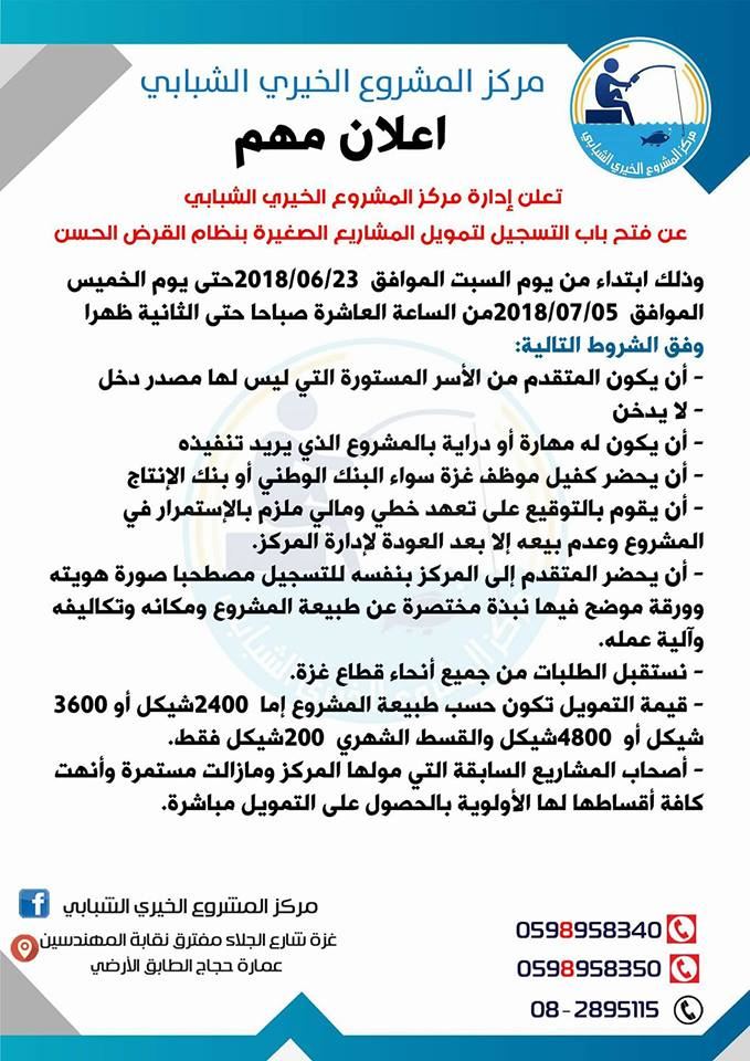 فتح مركز المشروع الخيري الشبابي اليوم السبت 23-6-2018 لجميع الراغبين بالتسجيل في تمويل المشاريع الصغيرة بنظام القرض الحسن،
