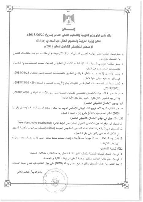 ولفتت الوزارة إلى أن اجراءات التسجيل هي: توجه الطالب لأحد فروع البنك الوطني الاسلامي القريب من سكناه وتسديد رسوم 200 شيكل، ثم الدخول إلى موقع التسجيل الخاص بالامتحان الشامل عبر الانترنت على الرابط ( أدناه ) والتسجيل في الموقع باستخدام نظام التسجيل الحكومي الموحدsos)) بإدخال رقم الهوية وكلمة المرور في المكان المخصص والنقر على أيقونة الدخول.