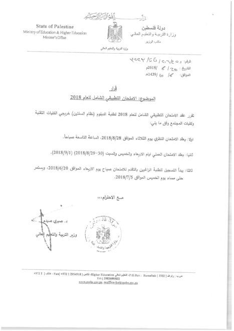 ولفتت الوزارة إلى أنه بناء على قرار معالي وزير التربية والتعليم العالي فإن الامتحان سيعقد بشكل متزامن بين شقي الوطن الضفة وغزة ، حيث يعقد الامتحان النظري يوم الثلاثاء الموافق 28/8/2018 الساعة التاسعة صباحاً، أما الامتحان العملي فيعقد بتاريخ 30-29 /8 /2018 و1 /9 / 2018.