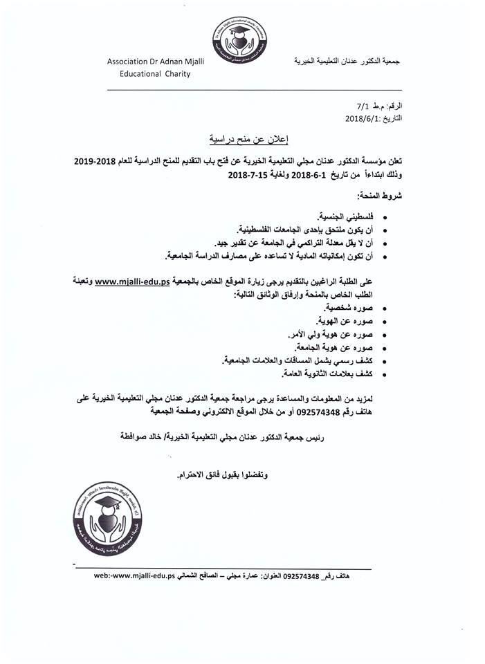 اعلان منح دراسية جديدة -- مؤسسة الدكتور عدنان مجلي التعليمية الخيرية نموذج التسجيل calendar_month2018/06/25 04:50 pm visibility 6,504 مقالات ذات صلة share منح دراسية في تونس للدراسات العليا للعام 2025/2026التفاصيل ...share منح في جامعة قبرص للتكنولوجيا للعام الدراسي 2025/2026التفاصيل ...share مقاعد الاختصاص العالي في الطب بالأردن للعام 2025/2026التفاصيل ...share فتح باب التسجيل في منحة تحرير الشهادات الجامعية "العالقة" لخريجي الجامعات المحلية في قطاع غزة (الدبلوم والبكالوريوس)التفاصيل ...share منح دراسية ممولة جزئياً في باكستان للبكالوريوس والماجستير والدكتوراه 2025/2026التفاصيل ...share منح دراسية في تخصص الطب البشري في كوبا 2025/2026التفاصيل ... يمنع استخدام برامج النسخ